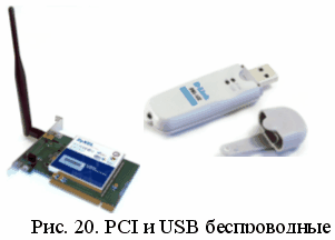 стоимость своих электрических «собратьев», при более низкой скорости передачи данных. Для подключения компьютеров используются сетевые адаптеры с PCI интерфейсом (на рис. 20 слева) и с USB интерфейсом (на рис. 20 справа). Беспроводной доступ может быть организован и с помощью обычных сетевых адаптеров, но в этом случае сетевой адаптер должен быть подключен к радиоприёмнику/передатчику (точке беспроводного доступа). Один из вариантов исполнения точки беспроводного доступа приведен на рисунке 21. Подключение сетевой платы к радиоточке выполняется с помощью стандартного соединительного шнура (рис. 19 слева). Кроме того, точка доступа исполняет роль центра беспроводной сети при объединении более двух компьютеров в беспроводную сеть. В таком случае она подключается к компьютеру, играющему в данной сети главенствующую роль – серверу. Либо при подключении точки доступа через маршрутизатор к проводной сети, вы получаете возможность обмениваться информацией со стационарными компьютерами.