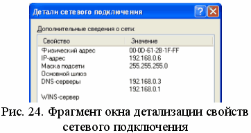 «Подробности» можно реинициализировать подключение, нажав кнопку «Исправить» и просмотреть некоторые параметры адресации протокола TCP/IP. Более подробно их же можно увидеть, нажав кнопку «Подробности». В окне «Детали сетевого подключения» (рис. 24) отображается MAC-адрес сетевого адаптера (физический адрес) и детали настройки сетевых служб.