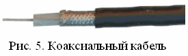 Коаксиальный кабель (рис. 5) представляет собой проводник, заключенный в экранирующую оплётку. От контакта с оплёткой проводник защищен трубчатым изолятором. Важной характеристикой кабельных систем вообще и коаксиального кабеля в частности является волновое сопротивление или импеданс. В локальных вычислительных сетях применяется коаксиальный кабель с волновым сопротивлением 50 Ом и (гораздо реже) в сетях ARCnet кабель с волновым сопротивлением 93 Ом. Существует две разновидности коаксиального кабеля – толстый (внешний диаметр около 10 мм) и тонкий (внешний диаметр около 5 мм). При одинаковом значении волнового сопротивления у толстого и тонкого коаксиального кабеля различные характеристики по длине кабельного сегмента и количеству поддерживаемых абонентов сети. У толстого коаксиального кабеля максимальная длина сегмента 500 метров, максимальное количество точек подключения 100. У тонкого коаксиального кабеля максимальная длина сегмента 185 метров, максимальное количество точек подключения 30.