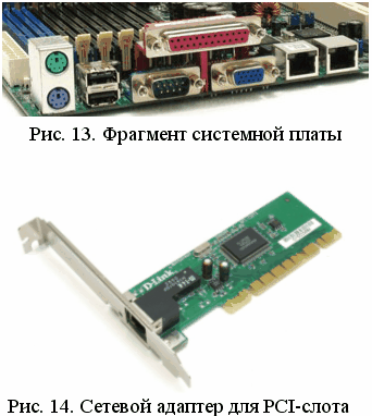 Встроенный сетевой адаптер (рис. 13 справа) входит в состав набора микросхем (чипсета), размещаемого на системной плате компьютера. Преимущества данного способа размещения – отсутствие дополнительных операций по монтажу сетевого адаптера в системном блоке. Если же в составе приобретённого компьютера сетевой адаптер отсутствует, а компьютер необходимо подключить к локальной вычислительной сети, придется воспользоваться одним из двух видов адаптеров, описанных ниже.