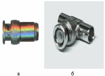 Тонкий коаксиальный кабель при монтаже разделяется на сегменты (отрезки). Оба конца отрезка разделываются (обрабатываются) способом подобным указанному на рис. 5. Затем на оба конца кабеля устанавливаются способом обжатия коаксиальные разъёмы (см. рис. 6а). На выходе сетевого адаптера также имеется соответствующий коаксиальный разъём, к которому при помощи BNC Т-коннектора (см. рис. 6б) подключаются два кабельных сегмента, соединяющих подключаемый компьютер с двумя соседними абонентами.
