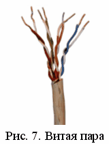 Второй вариант электрического проводника, используемого при монтаже локальных вычислительных сетей, получил название витая пара. Фактически кабель, называемый витой парой представляет собой восемь (реже четыре) проводника свитых попарно с определённым шагом (шесть оборотов на дюйм) и заключенных в общую изолирующую трубку (рис. 7). Такой кабель называется неэкранированная витая пара UTP (Unshielded Twisted Pair - неэкранированные скрученные пары). Если каждая пара перевитых проводов заключена в металлический экран (фольга или оплётка), и затем вся совокупность таких экранированных пар закрыта общим экраном, такой кабель называют экранированная витая пара STP (Shielded Twisted Pairs - экранированные скрученные пары). Применение экранов позволяет снизить уровень помех, создаваемых таким кабелем, и увеличить помехозащищённость такого кабеля от внешних помех. Скорость передачи информации по таким кабелям достигает, в настоящее время, 1000 Мегабит в секунду.