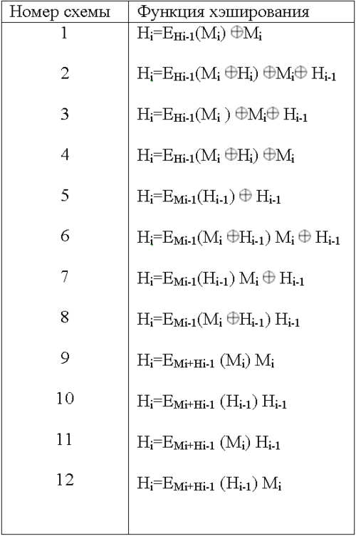 Табл. 1. Схема безопасного хеширования, у которых длина хеш-значения равна длине блока