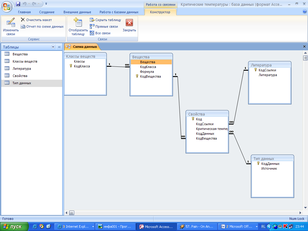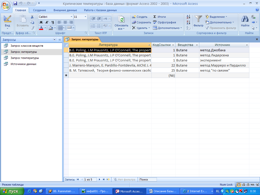 Создание базы данных критических свойств веществ в редакторе баз данных MS Acsess