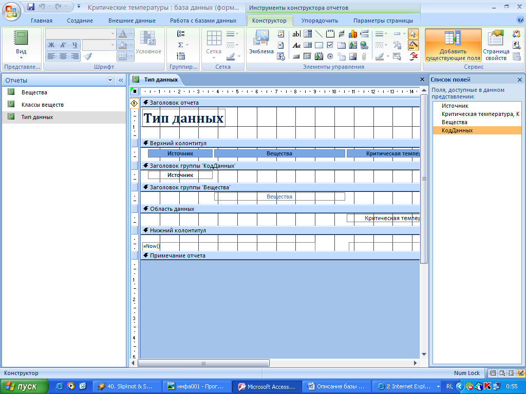 Отчет Классы веществ создан для наглядной демонстрации критических температур веществ, распределенных по классам. Для каждого вещества приведен расчет максимального значения из приведенного набора температур для оптимизации работы с данными. Отчет в режиме конструктора: