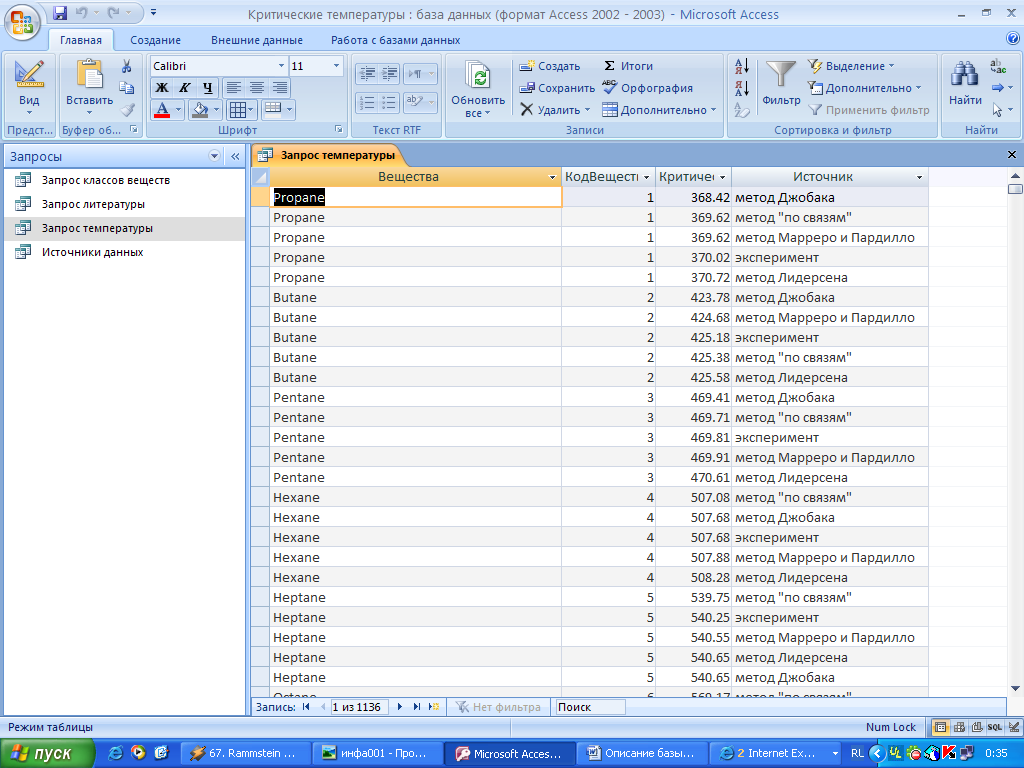 Запрос Источники данных позволяет также легко систематизировать данные по источникам данных по критическим температурам, значениями и индивидуальными веществами. При этом поля КодДанных и Критическая температура отсортированы по возрастанию.
