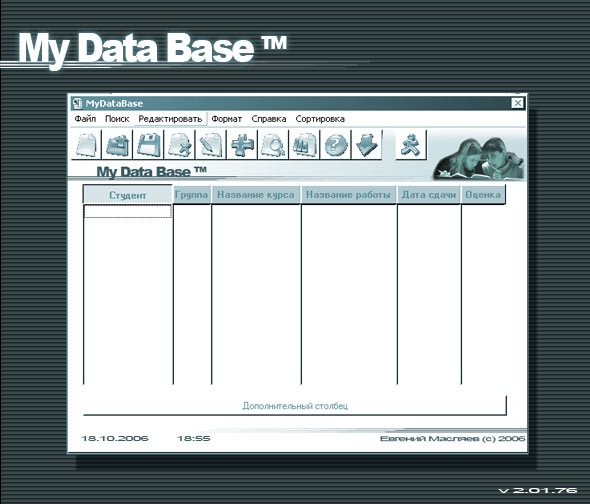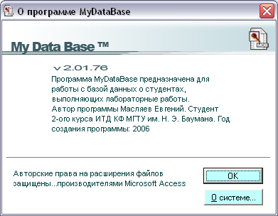 Public Const strDescription = "Программа MyDataBase предназначена для работы с базой данных о студентах, выполняющих лабораторные работы." + vbNewLine + "Автор программы Масляев Евгений. Студент 2-ого курса ИТД КФ МГТУ им. Н. Э. Баумана." + vbNewLine + "Дизайнер: Серегин Арсеий. Студент 2-ого курса ФКДиР МГУП. Год создания программы: 2006" 'Краткое описание