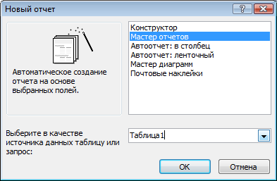 2) В окне Создание отчетов в качестве источника данных выберем Таблицу 1, после чего на панели Доступные поля отобразятся все поля таблицы.