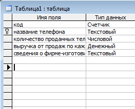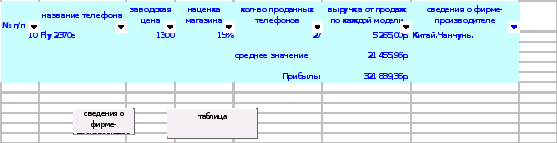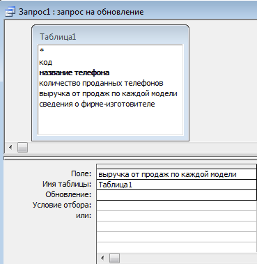 Щелкнуть по первой пустой ячейке строки Поле, нажать по значку раскрывающегося списка, а затем щелкнуть по имени Название телефона; аналогично формируется поле Заводская цена, Количество проданных телефонов и Сведения о фирме-изготовителе.