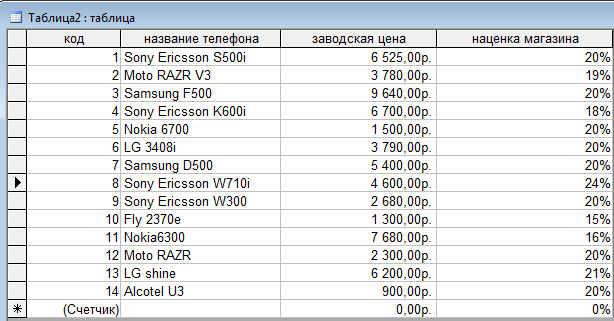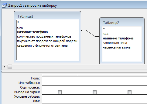 Базу данных мы разбиваем на две таблицы, в каждой из которых свои поля. Первая таблица содержит такие поля, как название телефона, заводская цена, наценка магазина и количество проданных телефонов. Вторая таблица содержит следующие поля: название телефона, выручка от продаж по каждой модели и сведения о фирме-изготовителе.