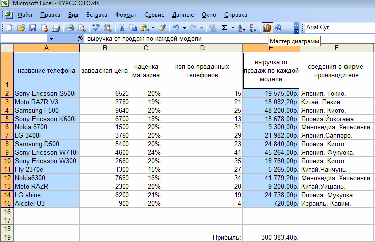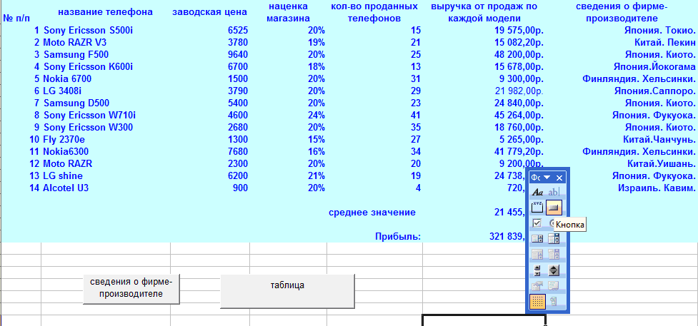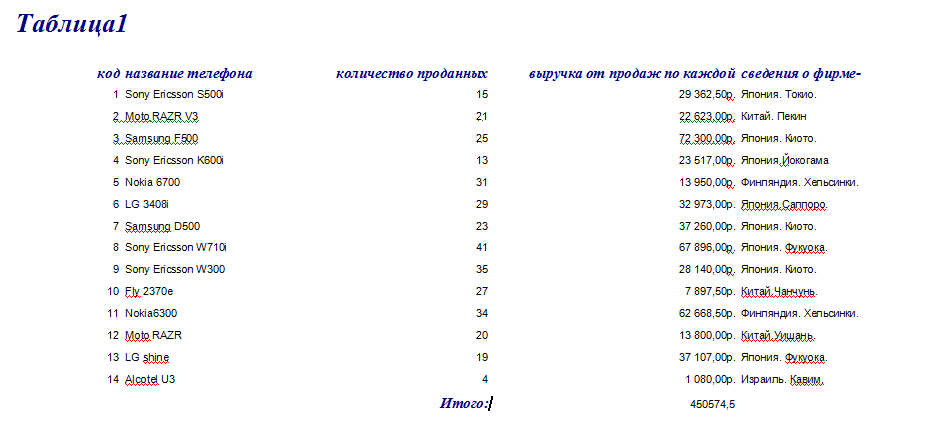 После нажатия на панели инструментов значка в виде восклицательного знака у нас появится таблица со всеми искомыми телефонами, изготовленными в указанной стране и городе.