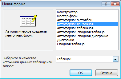 В окне Новая форма выделите Автоформа: ленточная, выберите в качестве источника данных Таблицу1 и щелкнуть по кнопке Ок.