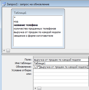 В ячейку строки Обновление поля Выручка от продаж по каждой модели вводим выражение 1,5*[Выручка от продаж по каждой модели].