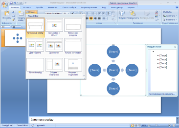 Для использования в презентации организационной диаграммы на панели Область задач Разметка слайда выберите соответствующий макет авторазметки. По стрелке откроется перечень:
