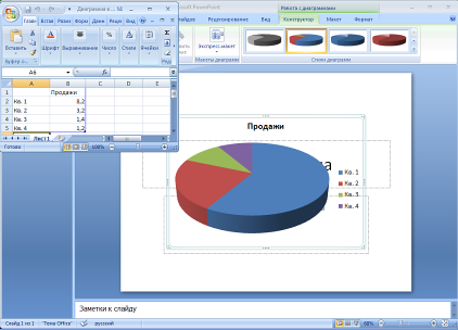 Диаграммы всех приложений Office XP ничем не отличается. При создании графической схемы в программе подготовки презентаций укажите тип диаграммы и введите исходные данные в «рабочий лист» – усеченный вариант рабочего листа электронной таблицы.