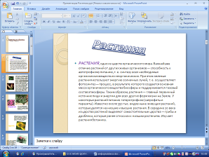 В левой части экрана размещается Панель переключения, которую можно использовать для переключения между режимами структуры и слайдов. В приложении каждый слайд презентации представляется миниатюрным изображением, показанным в режиме слайдов. Презентация состоит из множества слайдов.