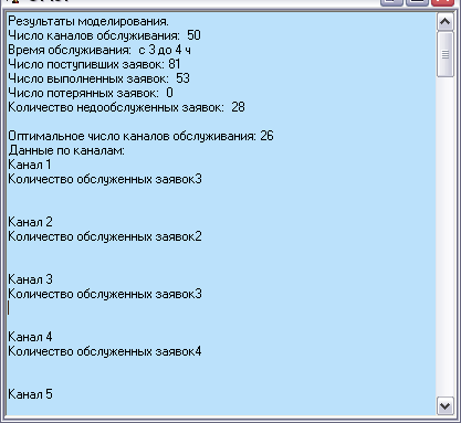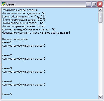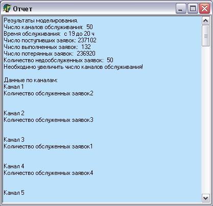 Окно отчета содержит информацию о результатах моделирования в общем: число каналов обслуживания, число поступивших заявок, число выполненных заявок, время обслуживания, количество недообслуженных заявок.
