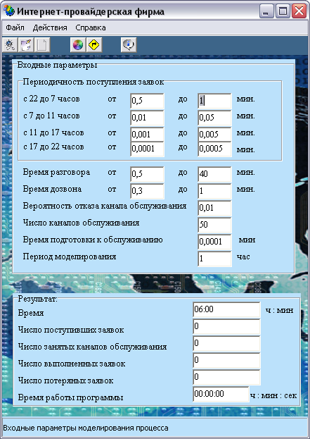По заданию к курсовой работе необходимо разработать программу реализации алгоритма имитационного моделирования системы массового обслуживания «Интернет-провайдерская фирма». Предусмотреть возможность настройки основных параметров входящего потока, обслуживающих приборов и дисциплины обслуживания.