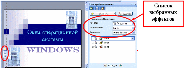В области Настройка анимации перетащите второй эффект (для окна) на первое место в списке эффектов ( на первом месте должен быть заголовок).