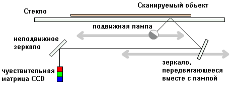 Рассмотрим принцип действия планшетных сканеров, как наиболее распространенных моделей. Сканируемый объект кладется на стекло планшета сканируемой поверхностью вниз. Под стеклом располагается подвижная лампа, движение которой регулируется шаговым двигателем.
