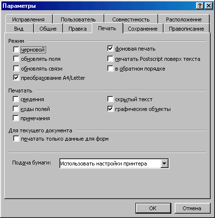 Чтобы установить или изменить дополнительные опции печати Word, сделайте следующее: