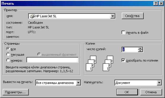 3. Выберите команду ФайлПечать, установите необходимые параметры в диалоговом окне Печать и щелкните по ОК.