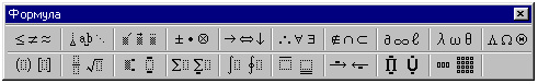 Панель инструментов Формула состоит из двух рядов кнопок. Верхний ряд кнопок содержит палитры символов. Из этих палитр вы можете выбирать символы, которые Equation Editor вставит в место расположения курсора вставки. Второй ряд содержит палитры шаблонов. Эти палитры позволяют выбирать распространенные математические структуры. Большинство шаблонов содержат прямоугольник из пунктирных линий – поле, которое представляет собой ячейку для вставки одного или нескольких символов, а также специальные значки, относящиеся к данной структуре. Некоторые шаблоны (например, дроби или интегралы) содержат по несколько полей для отдельных составных частей конструкции.