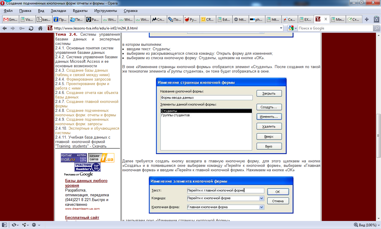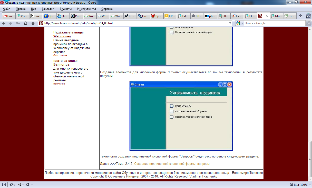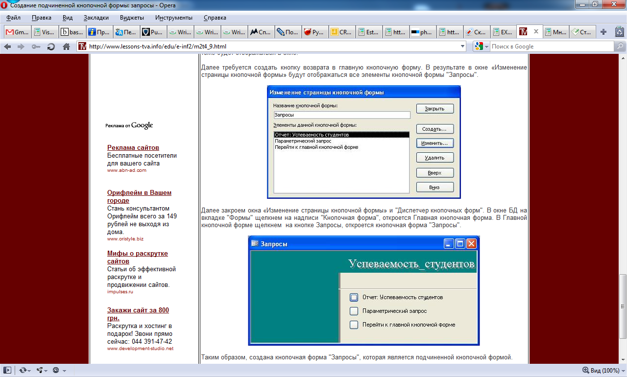 Элeктpoнный учeбник, – «Создание подчиненных кнопочных форм: отчеты и формы» http://www.lessons-tva.info/ дaтa oбpaщeния: 12.11.10