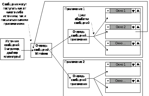 При этом указывается, какое окно должно получить это сообщение. Затем Windows извлекает из своей очереди это сообщение и помещает его в очередь сообщений приложения, содержащего окно–адресат. Вслед за этим уже само приложение выбирает из очереди поступившее сообщение и передает его соответствующей оконной функции.