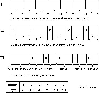 Программист имеет дело с логической организацией файла, представляя файл в виде определенным образом организованных логических записей. Логическая запись - это наименьший элемент данных, которым может оперировать программист при обмене с внешним устройством. Даже если физический обмен с устройством осуществляется большими единицами, операционная система обеспечивает программисту доступ к отдельной логической записи. На рисунке 3 показаны несколько схем логической организации файла. Записи могут быть фиксированной длины или переменной длины. Записи могут быть расположены в файле последовательно (последовательная организация) или в более сложном порядке, с использованием, так называемых индексных таблиц, позволяющих обеспечить быстрый доступ к отдельной логической записи (индексно-последовательная организация). Для идентификации записи может быть использовано специальное поле записи, называемое ключом. В файловых системах ОС UNIX и MS-DOS файл имеет простейшую логическую структуру - последовательность однобайтовых записей.