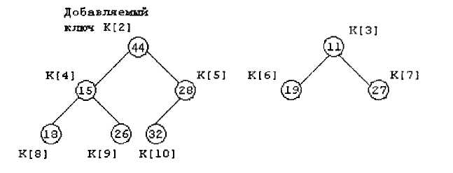Предположим, что дана пирамида с элементами К[3], К[4],…, К[10] нужно добавить новый элемент К[2] для того, чтобы сформировать расширенную пирамиду К[2], К[3], К[4],…, К[10]. Возьмем, например, исходную пирамиду К[3],…, К[10], покачанную на рисунке 3, и расширим эту пирамиду «влево», добавив элемент К[2] =44.