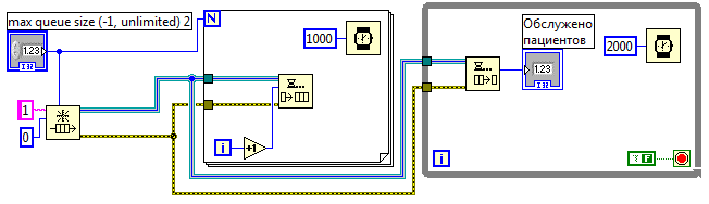 Очередь инициализирована. Далее необходимо определить порядок становления пациентов в очередь. Установите прибор Programming>Synchronization>Queue Operation>Enqueue Element и с помощью катушки соедините выходы queue out и error out из прибора Obtain queue к соответствующим входам прибора Enqueue Element. Так как пациент не один, необходима циклическая работа программы. Выберите из функциональной панели programming>structures>For Loop и выделите с помощью левой кнопки мыши прибор Enqueue Element. Чтобы пациенты становились в очередь по одному, перетяните «увеличение на 1» Programming>Numeric>increment. К входу x подключите значок «итерация цикла», а выход (x+1) пиктограммы подключите к входу Element прибора Enqueue Element. Пусть каждый пациент приходит в поликлинику через заданное время, например через 1 секунду. Для этого установите в цикл задержку. Выберите Programming>Timing>Wait (ms) и перетяните данную иконку в цикл. Создайте для нее константу, соответствующую этой задержке. Для этого подведите указатель в виде катушки к левой части иконки, нажмите правую кнопку мыши и выберете пункт создания константы Create>Constant. Чтобы количество итераций цикла было равно количеству пациентов, прибывающих в поликлинику, соедините выход управляющего элемента Numeric Control с пиктограммой N, как показано на рис. 12.