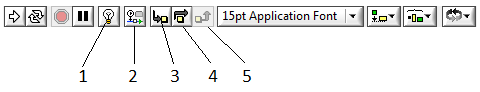 Линейка инструментов. Оба окна, как интерфейсное, так и окно редактирования диаграмм имеют линейки инструментов, которые содержат служебные кнопки и индикаторы состояния, предназначенные для контроля Виртуальных Инструментов. Одна из линеек инструментов всегда доступна, и ее вид зависит от того, в каком окне Вы находитесь. Линейка инструментов интерфейсного окна содержит 8 кнопок, рис. 5.