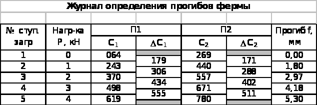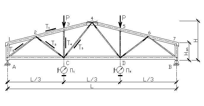 Испытание фермы производится на балочном испытателе. Нагрузка создается гидравлическими домкратами. Для определения усилий в наиболее нагруженных стержнях фермы изменяются при помощи тензометров. Прогибы измеряются при помощи прогибомеров с ценой деления 0,01мм.