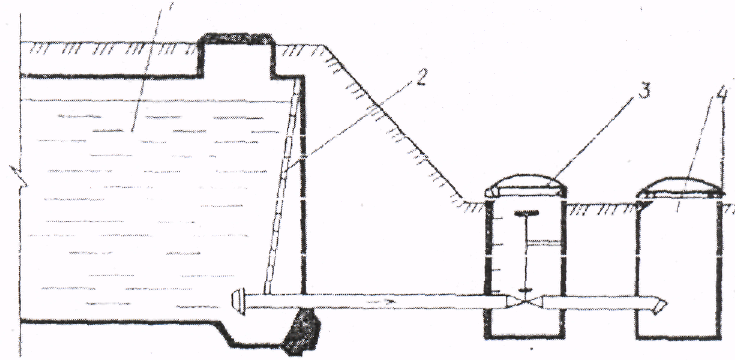1 – пожарный резервуар, 2 – лестница, 3 – колодец с задвижкой, 4 – приемный колодец вместительностью 3…5 м3