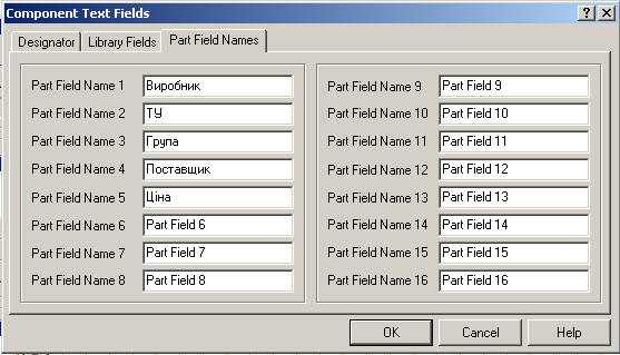 Поля користувача Part Fields заповнюються в редакторі схем. У редакторі бібліотек УГП можна лише перейменувати назви цих полів. Робиться це на вкладці Part Field Names діалогового вікна Component Text Fields, як показано на рис.2 (Tools " Description).