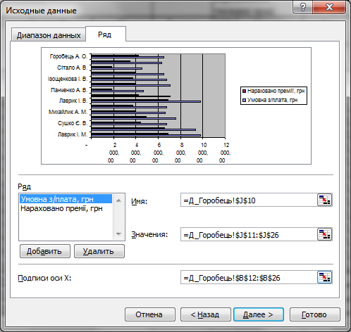 На робочому аркуші виділимо діапазони комірок (J10: J26, L10: L26) з даними Умовна з/плата та Нараховано премії (несуміжні діапазони виділяються за допомогою Ctrl).