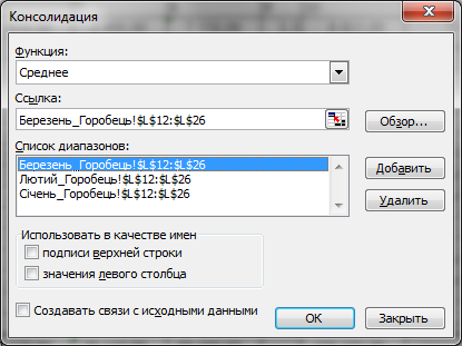 У списку “Функція” вибрати функцію, що використовується при об’єднанні даних, - середнє.