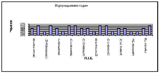 Діаграма стовпчикова за даними Відпрацьованих годин побудована за допомогою опції “Мастер диаграм” Стандартної панелі інструментів. У вікні “Мастера диаграм” вибраний вид діаграми, після натиску клавіші Вводу, відкривається наступне вікно “Мастера диаграм”. В листі ярлика “Диапазон данных” треба вказати діапазон даних (з таблиці) з котрого будуватиметься
