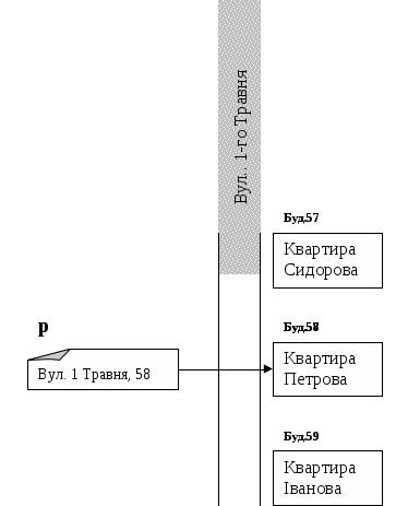 Змінна-вказівник (р) нагадує конверт, який містить лише адресу квартири Петрова, а не її вміст. Можна сказати, що змінна-вказівник р вказує на іншу змінну, яка знаходиться за адресою вул.. 1-го Травня, 58.