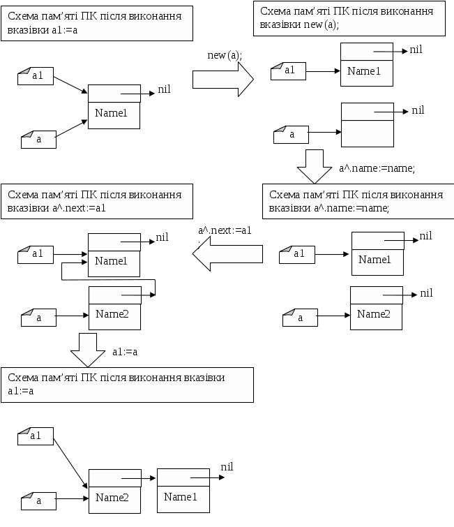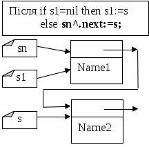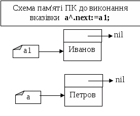 Елемент списку a1^– це динамічна змінна (наприклад типу zapis=record), яка в найпростішому випадку складається з двох полів: інформаційного (наприклад, name:string) та змінної-вказівника на наступний елемент списку (next:^zapis). Тобто, динамічна змінна – елемент списку – крім деякого значення містить адресу (змінну-вказівник) наступного елемента списку.