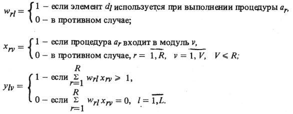 В этом случае критерий оптимального разбиения на модули информационного и программного обеспечения, содержание которого описано в табличной форме, формулируется следующим образом. Найти разбиение множества функций или процедур таблицы на непересекающиеся подмножества, минимизирующее суммарное число информационных связей между модулями при ограничениях: на число выделяемых модулей; на число информационных элементов, входящих в один модуль, определяющее сложность разработки блок-схемы подсистемы; на число процедур каждого модуля, определяющее, в основном, сложность кодирования блок-схемы; на число информационных связей между выделяемыми модулями; на совместимость отдельных процедур.