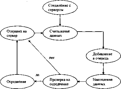В системе имеется глобальный объект-сервер и четыре объекта-датчика. Их взаимодействие заключается в следующем. Датчик отсылает показания на сервер в несколько этапов. Сначала полученное значение записывает в динамический список, затем по истечении заданного момента времени он берет первое значение из очереди и суммирует его с предыдущим. Потом проверяется заданное число на осреднение значения. Если мы накопили это число, то отсылается усредненное число, если же нет, то отсылается полученное значение. После вышеперечисленных действий значение из очереди удаляется. Очередь была введена затем, что интервал времени считывания значения, и его отсылки на сервер может не совпадать.