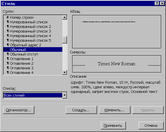 Этим способом можно менять любой стиль, в том числе и стиль Обычный. Изменение стиля в диалоговом окне Стиль требует бóльшего времени, чем использование образца текста, зато вы получаете дополнительные возможности: