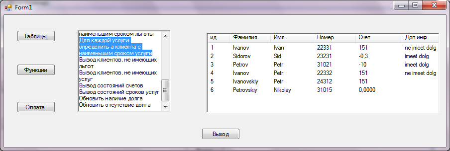 //участок кода, реализующий один из запросов на вывод таблиц в программе..в основном в остальных запросах изменяется лишь значение переменной q, в которую и вписывается сам запрос.