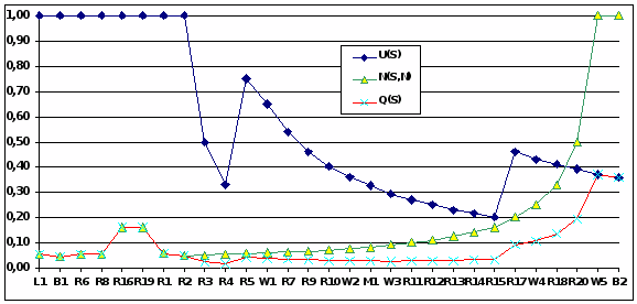 Применение аналогичных вычислений управляемостей (наблюдаемостей) для других вершин графа дает результат в виде графика, представленного на рис. 5, которые позволяют определить критические точки для установки необходимых ассерций.