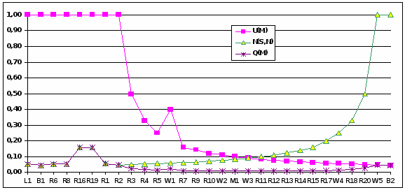 то кривая тестопригодности существенно поднимется вверх по оси ординат, чем обеспечивается меньший разброс параметров для каждой вершины. Данное обстоятельство фиксирует несколько отличные таблицы и графики, представленные ниже (рис.6).