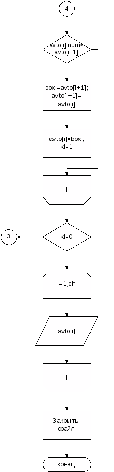 В 4 режиме необходимо организовать ввод данных, записать их в файл, вывести данные в виде таблицы и обработать их,используя такие стандартные операции, как сортировка и выборка данных. В результате будет получен список, отсортированный по возрастанию по данному полю методом пузырька. Условие выборки задается пользователем. Схема подпрограммы представлена на рисунке 5.