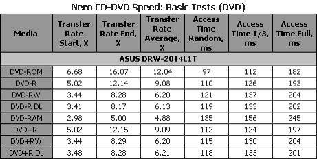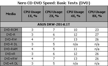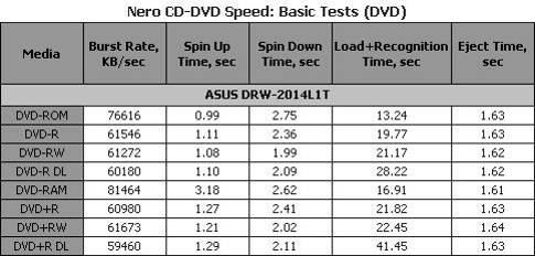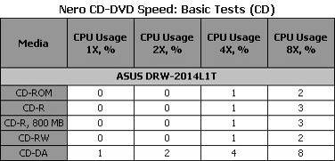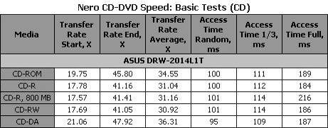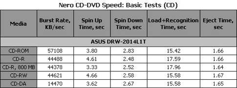 Максимальную скорость привод неожиданно продемонстрировал на аудиодисках CD-DA. Также интересно, что скорость работы с CD-R и CD-RW дисками одинакова, хотя на большинстве приводов вторые все же оказываются медленнее. Измеренное значение времени доступа для всех пяти носителей оказалось заметно меньше значения заявленного производителем для CD.