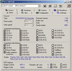 Судя по информации, представленной на скриншотах, привод является весьма полноценным устройством, обладающим поддержкой практически всех необходимых в работе аппаратных характеристик. Отдельно выделим наличие возможности чтения ошибок типа C2 – ну а качество ее реализации мы еще проверим ниже.